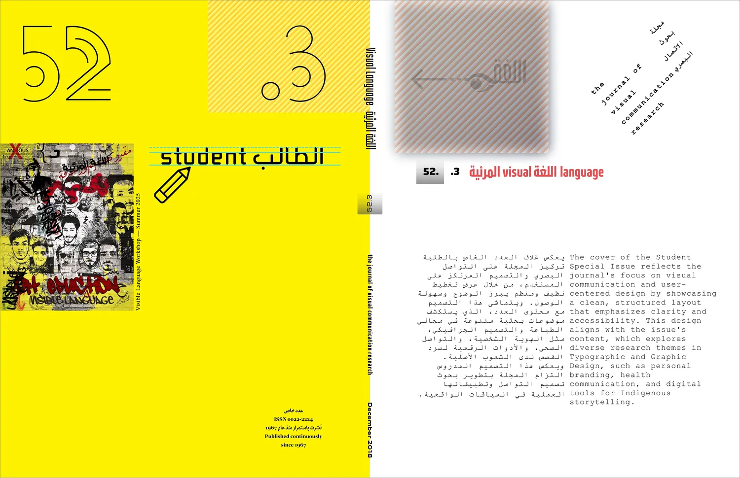 Student reinterpretation of Visible Language 52.3 (2018), combining modular English text with graffiti-style Arabic calligraphy. Featuring portraits of the students themselves, the cover channels a manifesto aesthetic rooted in youth identity and cultural voices. This design merges postmodern fragmentation with vernacular resistance.