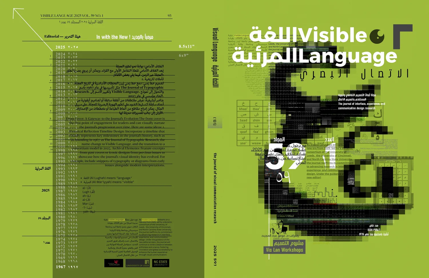 Student cover design inspired by Visible Language Vol. 59.1 (2025), In with the New!. This bilingual reinterpretation mimics the original cover while integrating Arabic “اللغة المرئية” and English “Visible Language” through pixelated layering and typographic fragmentation. Both scripts are given equal visual prominence, reflecting dialogic hybridity within the postmodern design framework. Here, mimicry functions both as a technical exercise and a critical lens, exposing the challenges of adapting Latin-centric design strategies to Arabic typographic structures.