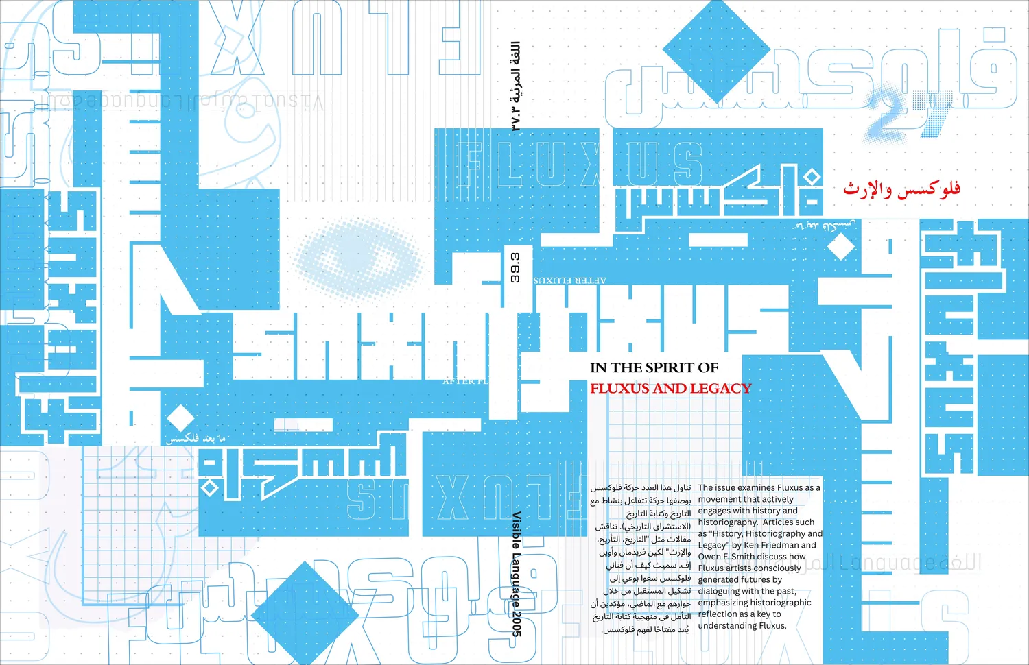 Student cover design inspired by Visible Language Vol. 39.3 (2005), In the Spirit of Fluxus and Legacy. This bilingual reinterpretation references the original modular composition while introducing Arabic and Latin scripts in a layered configuration. Through mirrored disruption, transparency, and visual rhythm, the student creates a dynamic interplay between scripts that reflect postmodern hybridity and bilingual negotiation.